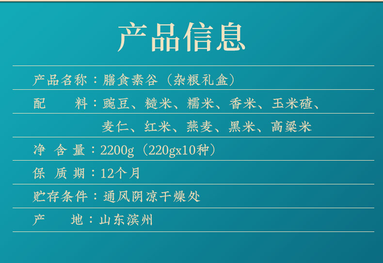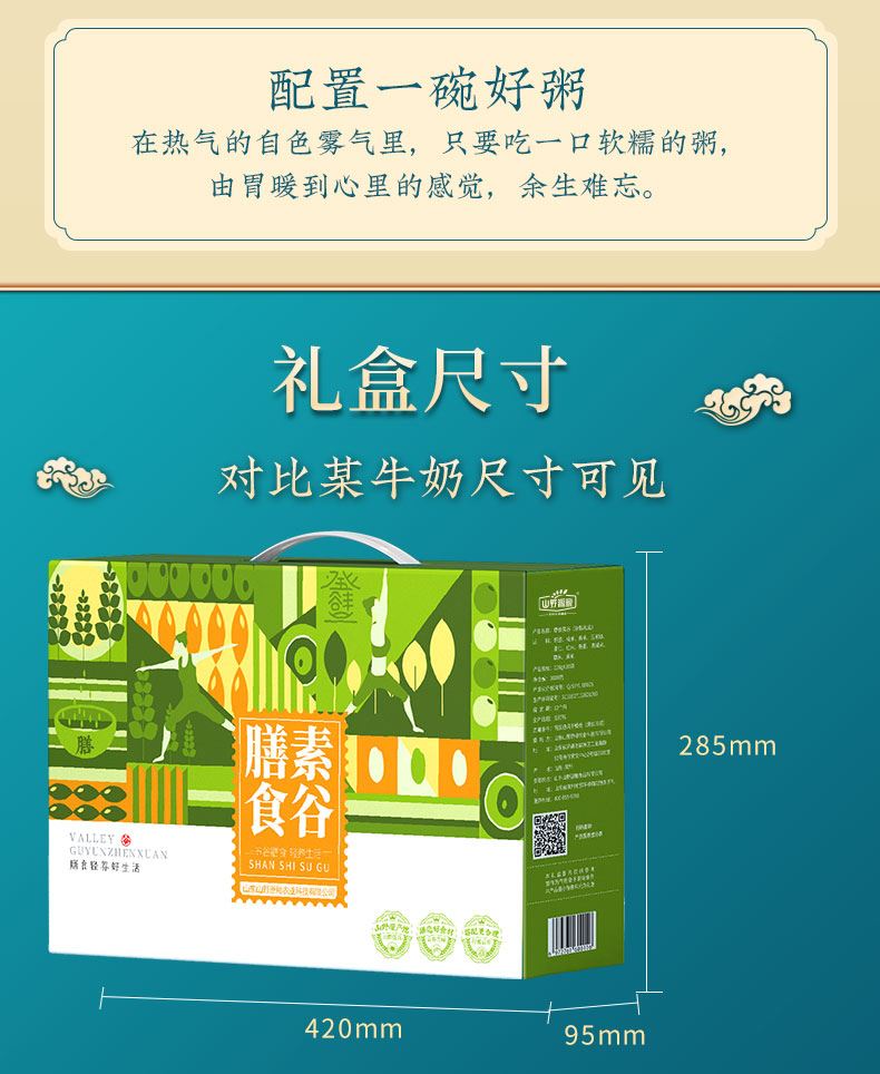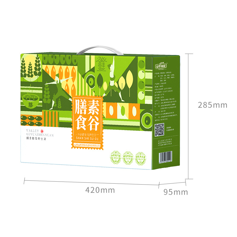 10种精选山野五谷 精美礼盒,真空彩袋,包装大气 条 码:6972761600116 规 格:2.2kg,220g*10 包 装:真空套彩袋 内 含:豌豆、糙米、香米、玉米碴、麦仁 红米、燕麦、黑米、高粱米、糯米 盒尺寸:42cm*9.5cm*28.5cm 6盒/箱 箱重量:16.56kg 箱尺寸:59.5*43*30(0.077方)