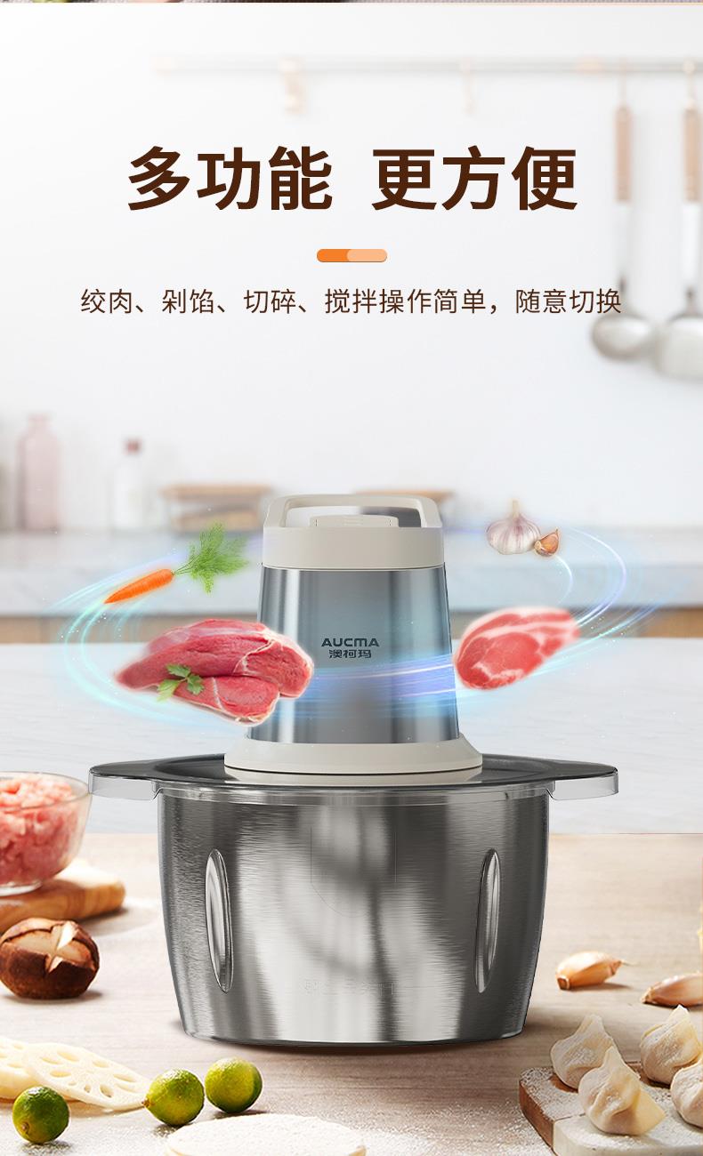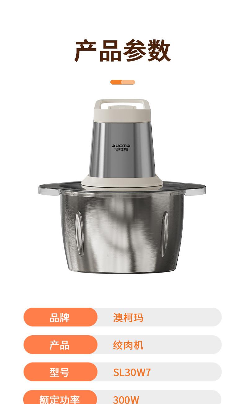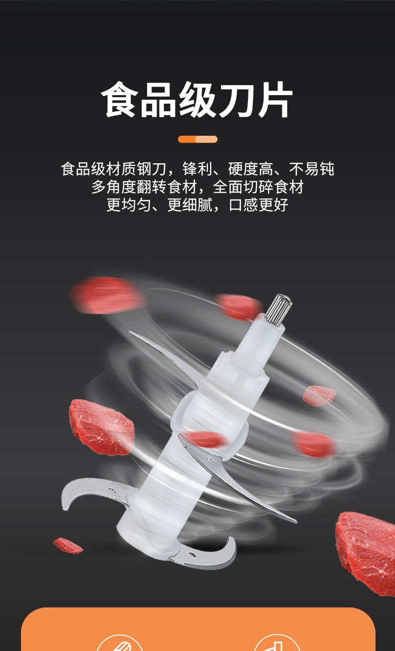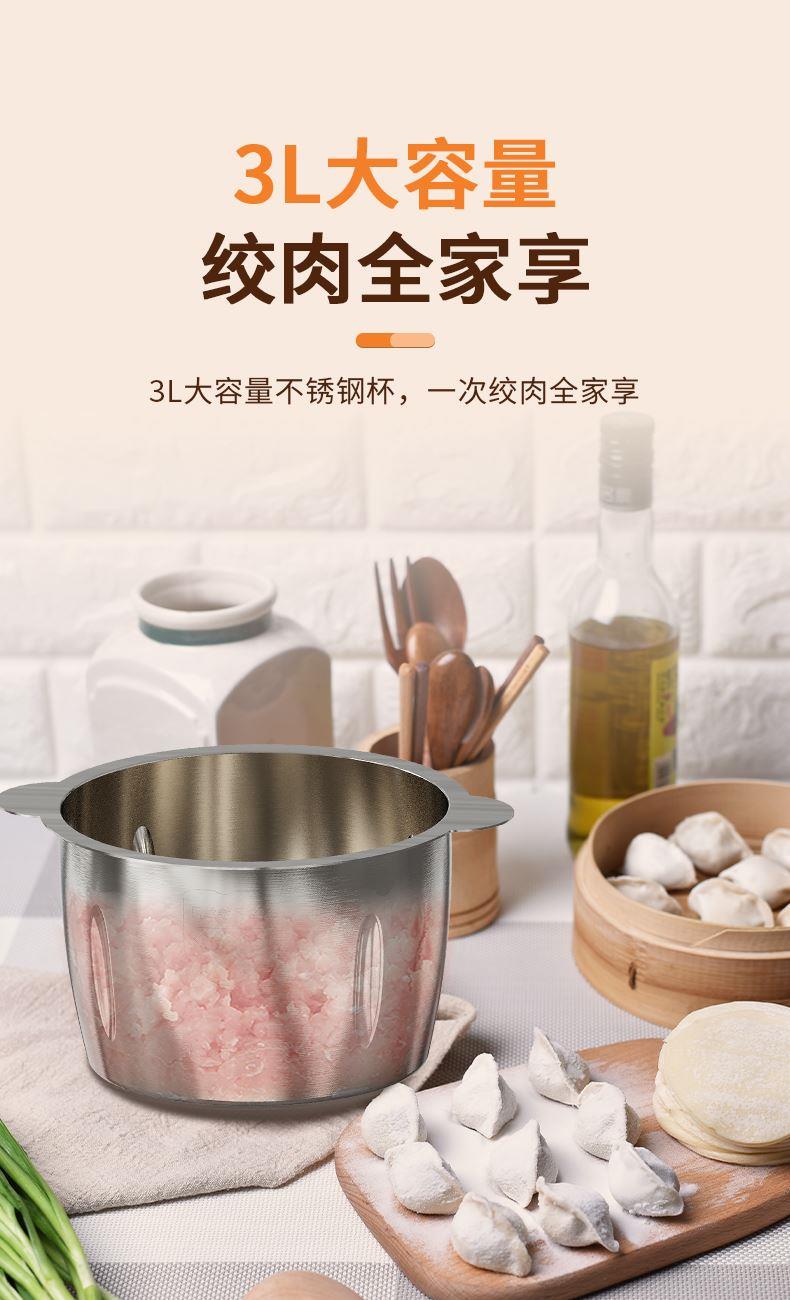 额定功率:300W 刀片:420食品级不锈钢4叶刀片(单刀) 额定容量:3L 净重:1.2kg 毛重:1.48kg 产品尺寸:240x192x285mm 外箱尺寸:340x210x170mm 3L大容量不锈钢杯,一次绞肉全家享 绞肉、剁陷、切碎、搅拌操作简单,随意切换 不锈钢无缝机头,无缝一体成型工艺,防锈,耐磨更美观 产品拥有松手即停、电机过热等保护,使用更安全。
