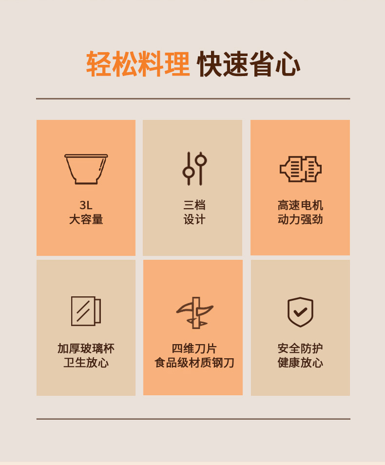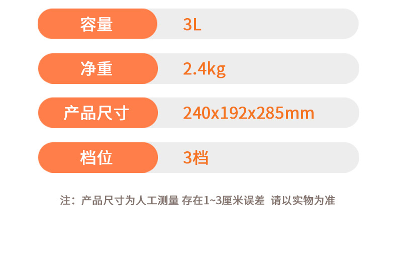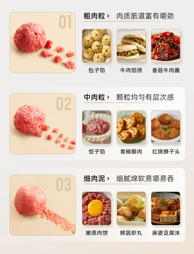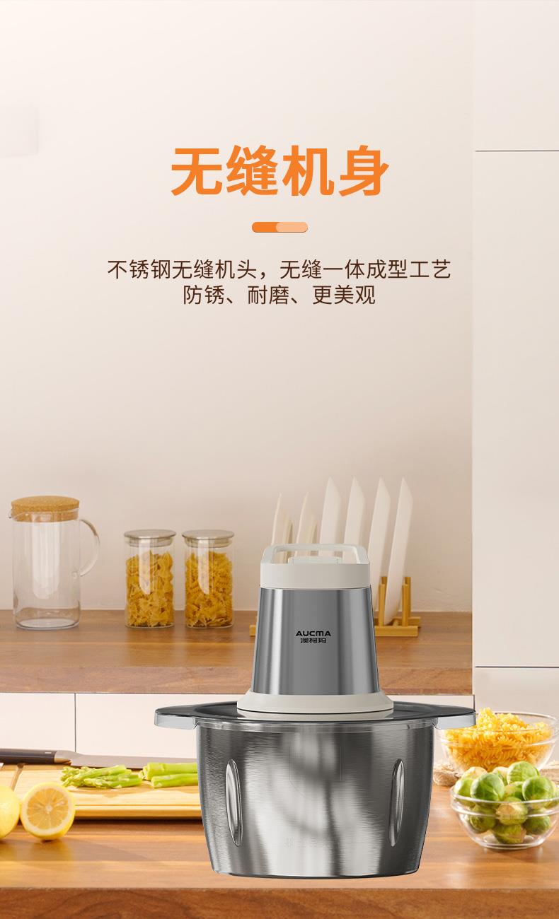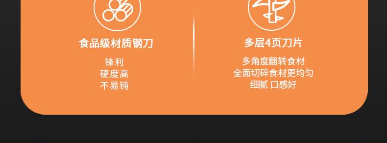 额定功率:300W 刀片:420食品级不锈钢4叶刀片(单刀) 额定容量:3L 净重:1.2kg 毛重:1.48kg 产品尺寸:240x192x285mm 外箱尺寸:340x210x170mm 3L大容量不锈钢杯,一次绞肉全家享 绞肉、剁陷、切碎、搅拌操作简单,随意切换 不锈钢无缝机头,无缝一体成型工艺,防锈,耐磨更美观 产品拥有松手即停、电机过热等保护,使用更安全。