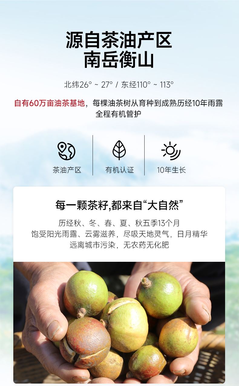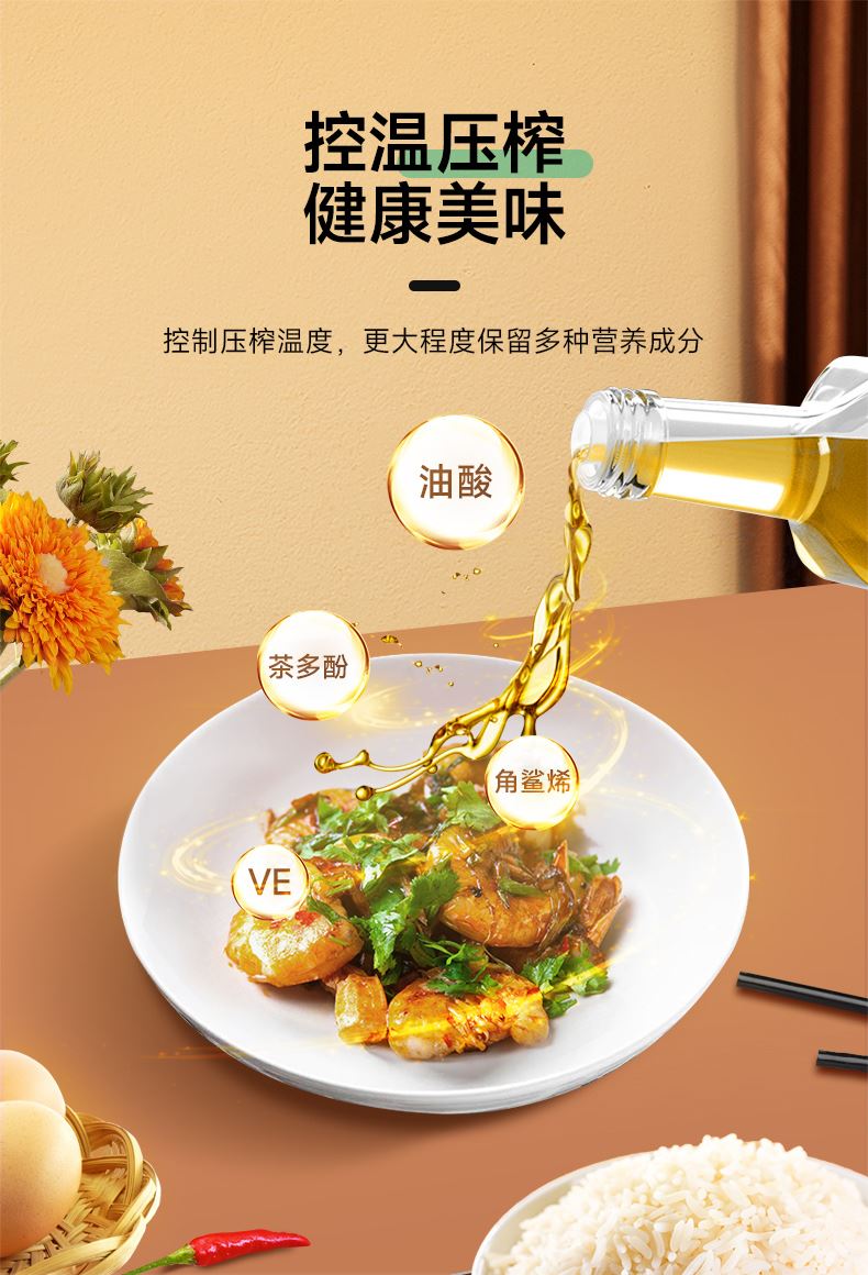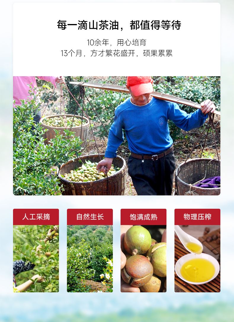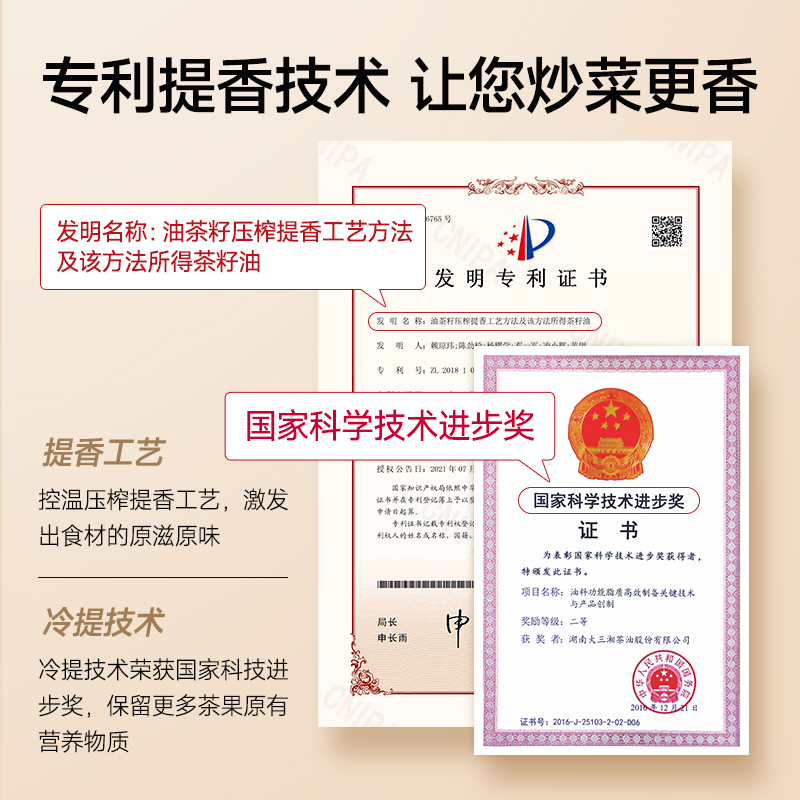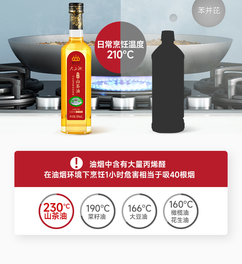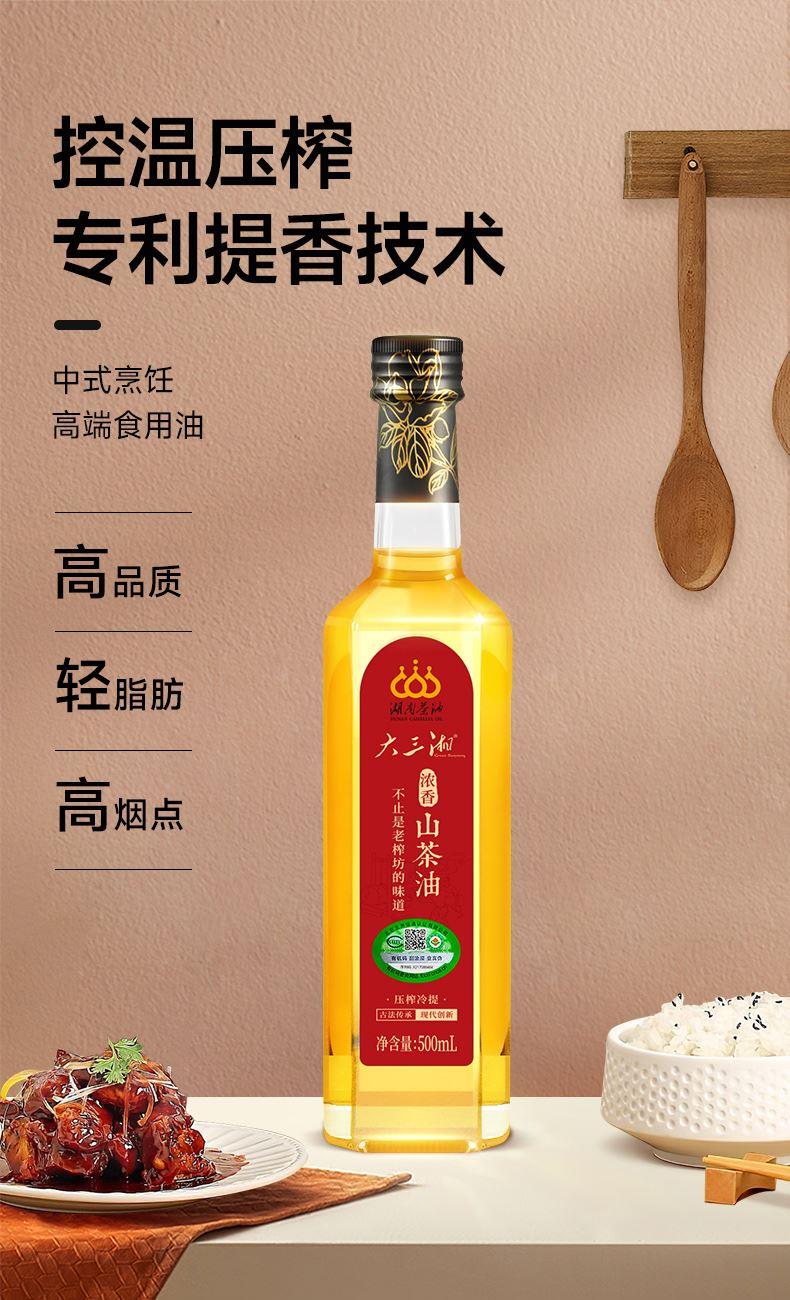 压榨冷提 1、浓香纯正,风味浓郁,不止是土榨坊的味道 自创风味浓郁的浓香山茶油增香技术,将茶油中特有的芳香气味封存在茶油里。 2、230 ℃高烟点 热锅下油味更浓 230°的高烟点,符合中国人的烹饪习惯,高温烹饪更能激发浓香茶油香味,且炒菜少有油烟,减少油烟危害。 3、荤菜好搭档 入味不腻 茶油分子小,渗透力强,能够激发食材原有风味,而且清爽不油腻,尤其适合做荤菜。