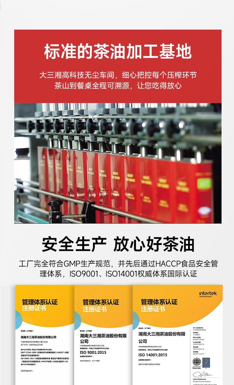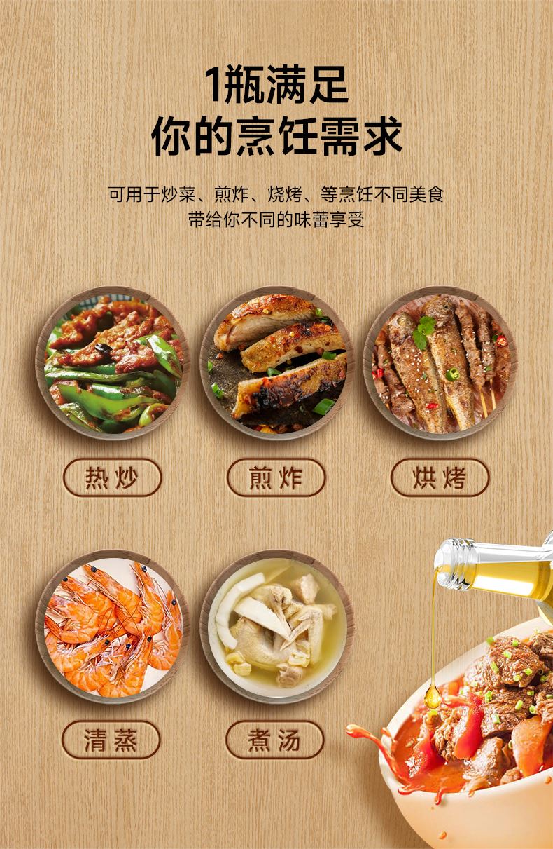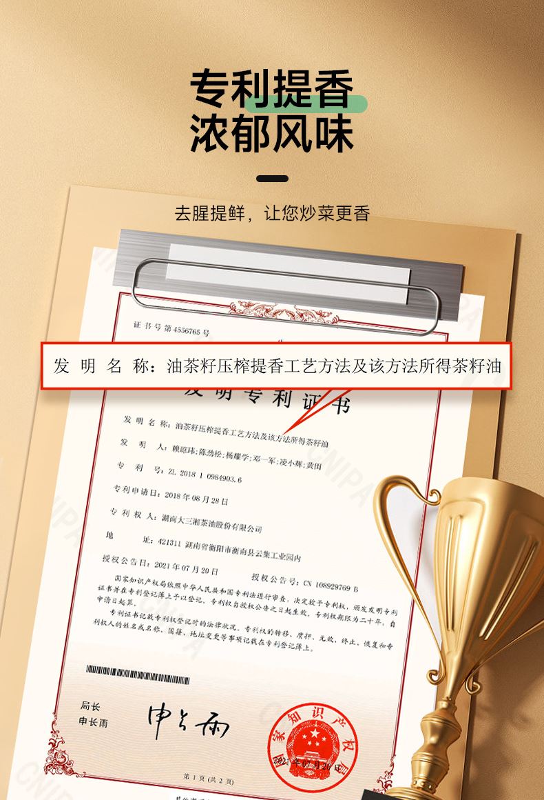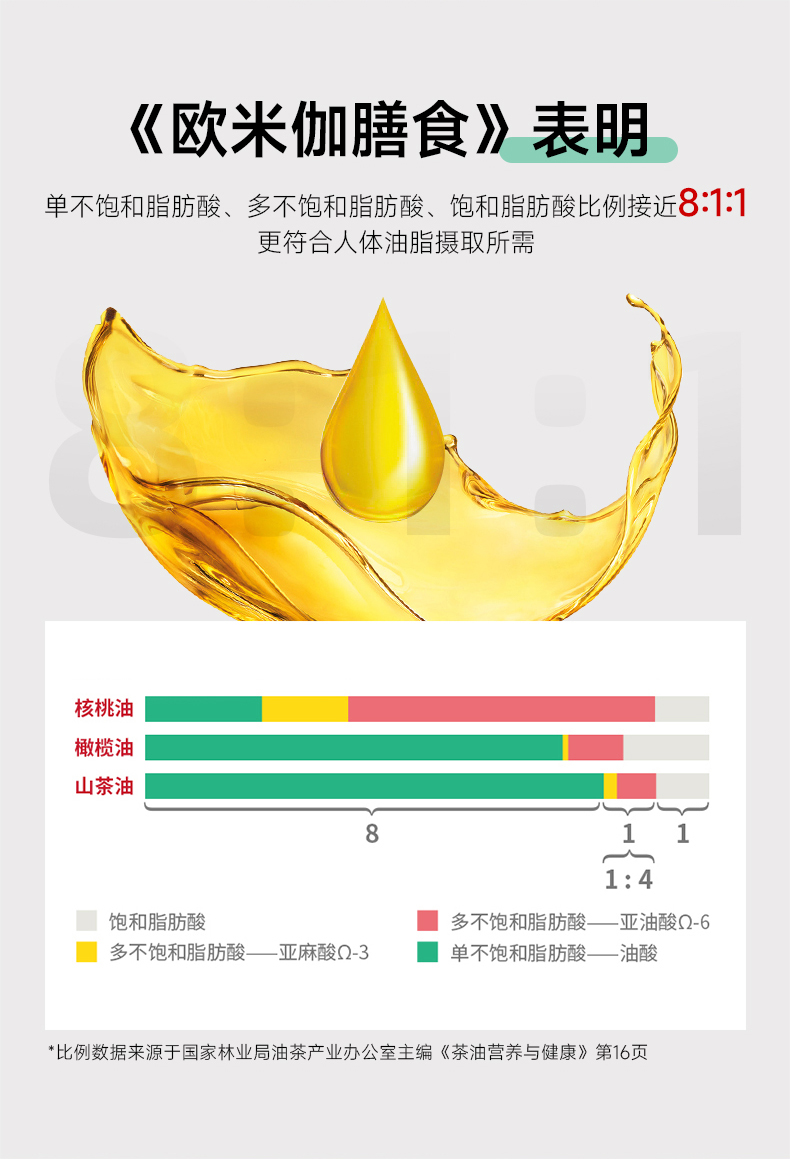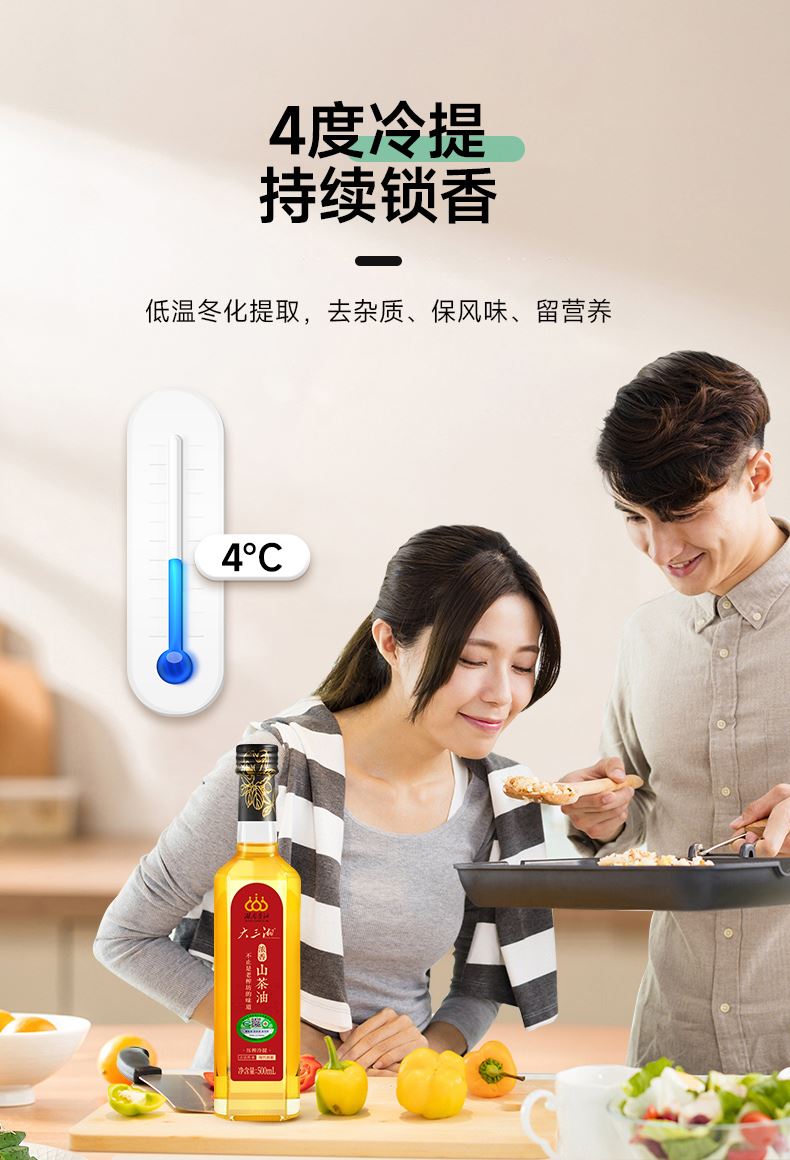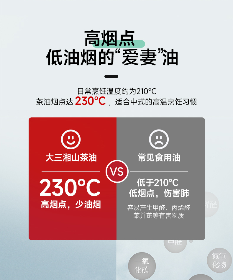 压榨冷提 1、浓香纯正,风味浓郁,不止是土榨坊的味道 自创风味浓郁的浓香山茶油增香技术,将茶油中特有的芳香气味封存在茶油里。 2、230 ℃高烟点 热锅下油味更浓 230°的高烟点,符合中国人的烹饪习惯,高温烹饪更能激发浓香茶油香味,且炒菜少有油烟,减少油烟危害。 3、荤菜好搭档 入味不腻 茶油分子小,渗透力强,能够激发食材原有风味,而且清爽不油腻,尤其适合做荤菜。