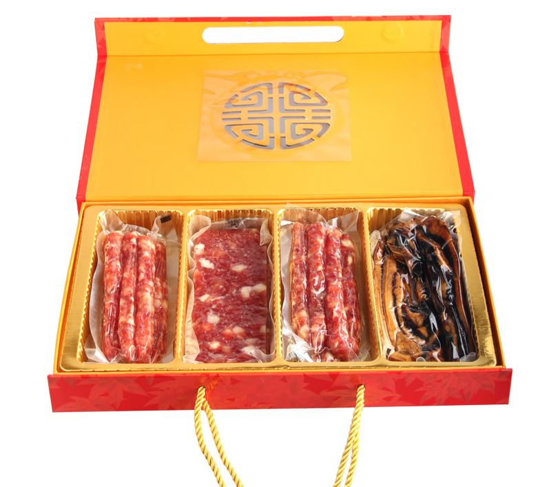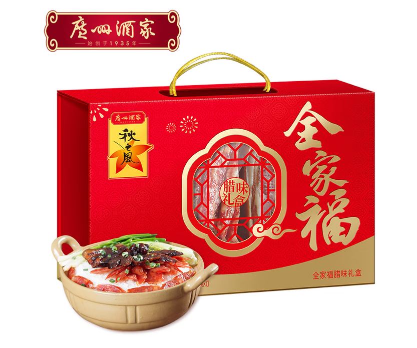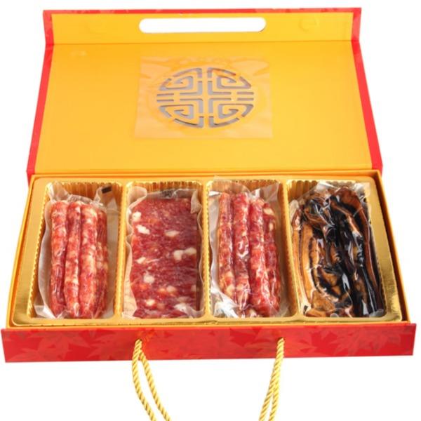 全家福腊味礼盒 内容物/主要原料:优级腊肠200克,腊肉200克,吉庆腊肠200克,肉脯200克 产品规格:1×10×800g 产品卖点 精选四款腊味,寓意全家有口福,家家有福气。 腊肠通透红润,腊香四溢;腊肉肉质紧实,豉香扑鼻,肥而不腻。 肉脯采用三七肥瘦比,肉粒压实定形,易于烹饪,切丝切块皆宜。 全新升级包装(加大尺寸),精美喜庆,送礼体面。